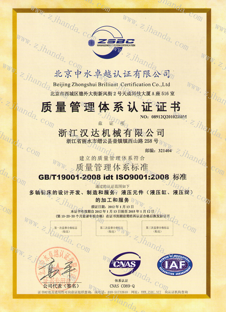 漢達(dá)公司通過ISO9000認(rèn)證,認(rèn)證范圍包括多軸鉆床、液壓元件