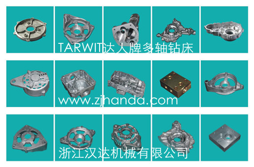該產(chǎn)品可廣泛應(yīng)用于機(jī)械行業(yè)多孔零部件的鉆孔及攻絲加工,如汽車、摩托車多孔零部件、發(fā)動機(jī)箱體、鋁鑄件殼體、制動鼓、剎車盤、轉(zhuǎn)向器、輪轂、差速殼、軸頭、半軸等,泵類、閥類、液壓元件、太陽能配件等等。比如以下工件: