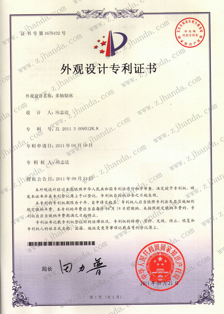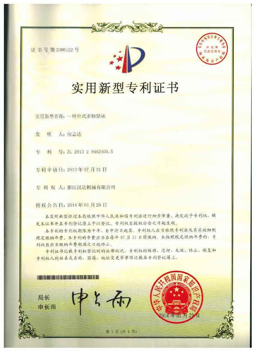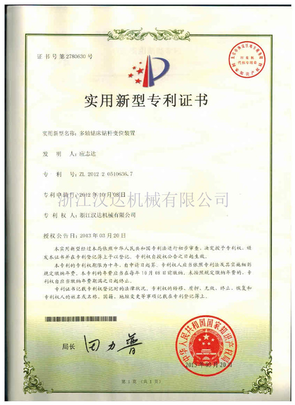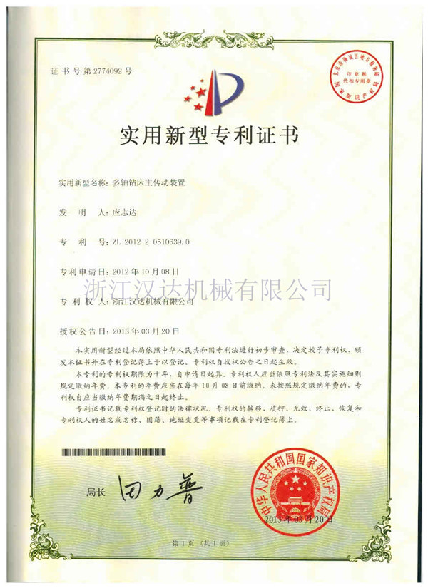 多軸鉆床潤滑系統(tǒng)新型專利證書